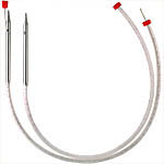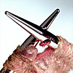 How do these needles work? You thread a yarn through each of the needles and then knit with another yarn. Laying the yarn that goes through the needles across your work, weaving it in with knit stitches using the third yarn. Using this technique you can be knitting with three different colours at once.